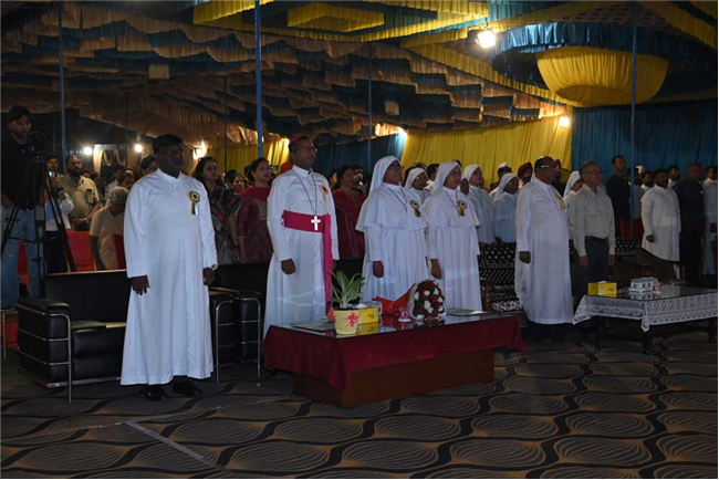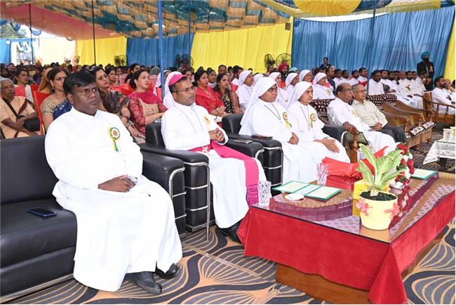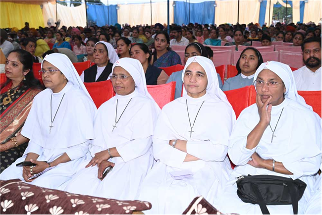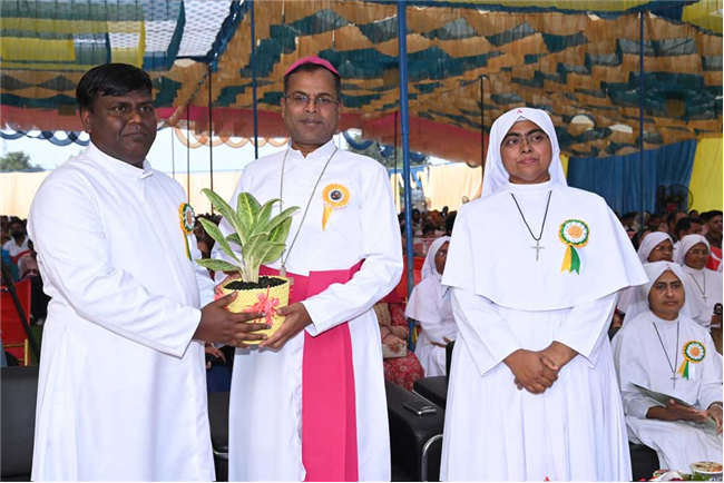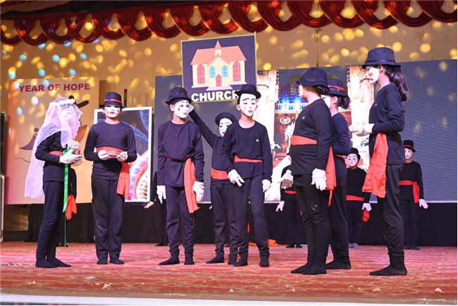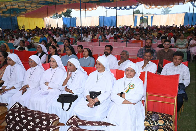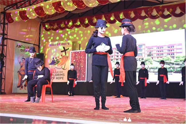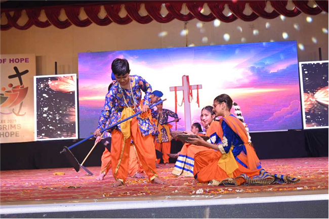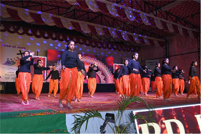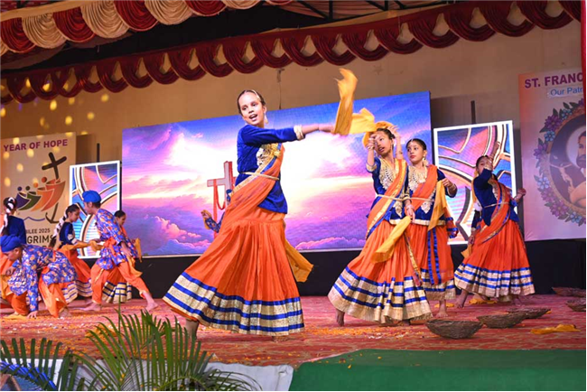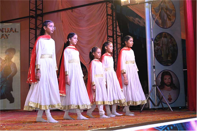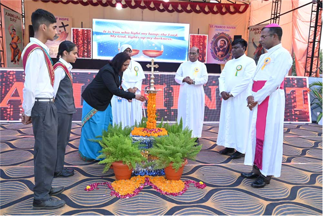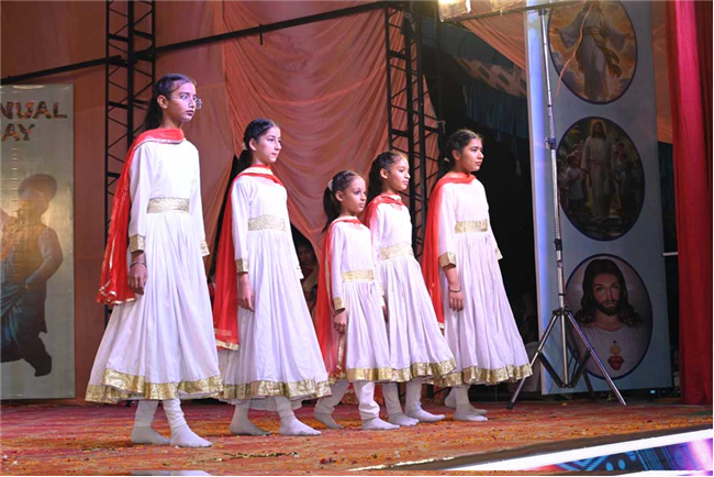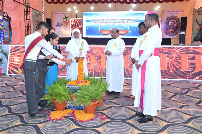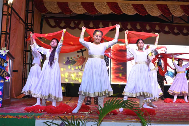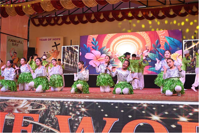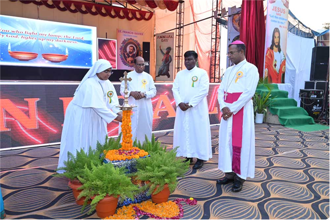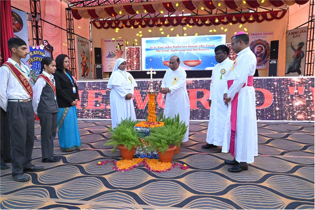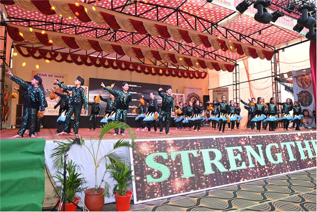 The Chief Guest, Most Rev. Bishop Dr. Sahaya Thetheus Thomas, was ceremoniously received with the resonant beats of the school band, marking a graceful commencement to the evening’s festivities. The presence of Reverend Fathers and Sisters from various parishes and institutions further lent solemnity and reverence to the occasion. The programme commenced with a soulful prayer dance, invoking divine blessings upon the gathering, followed by the lighting of the ceremonial lamp, symbolising the triumph of knowledge over ignorance and hope over despair.